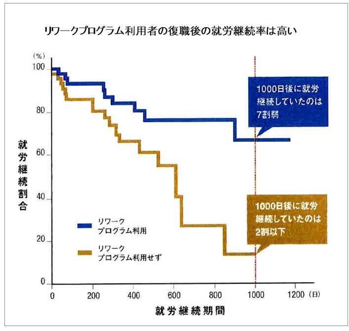 2012年にメディカルケア虎ノ門が行った復職後の就労継続状況調査では、リワークプログラムを利用して復職した人たちの就労継続率は、復職から1000日後には約7割となった一方、利用しなかった人たちでは2割以下という結果になり(上図)、復職前のリワークプログラムが効果的であることが分かります。