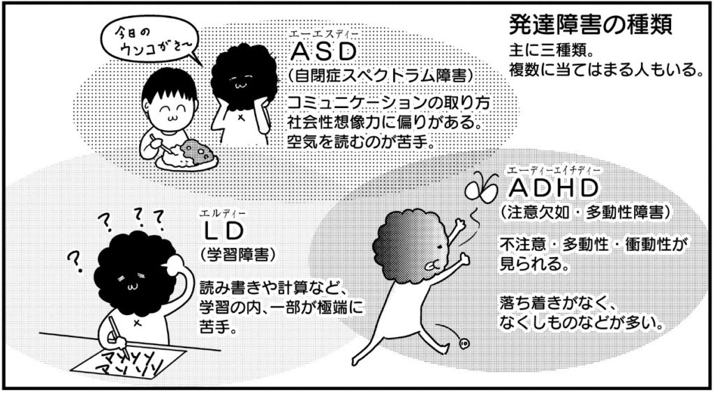 この図は発達障害の3つの種類を説明するものですが、それぞれの領域は重なっています。大人になるまで周囲に気づかれなかった「大人の発達障害」は、主にADHDとASDの両方の特性が混在するのが特徴です。