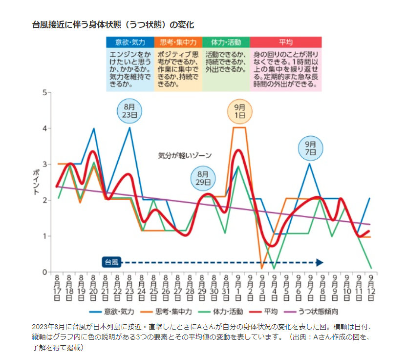 そして、台風は日本を直撃。その影響が続く間、Aさんの身体には、先に挙げた「頭痛、嘔気、倦怠感などの身体症状」や、「おっくう感、意欲の低下、憂鬱な気分、漠然とした不安感といった、うつの症状」が強く現れ続けていました。