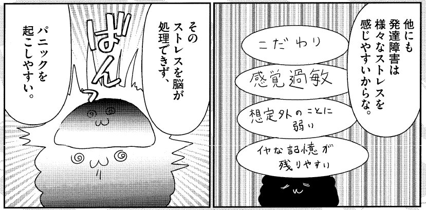 2コマのうち、右の漫画で積み重なっている4つはストレスの原因となっている発達障害由来の特徴です。上から「こだわり」「感覚過敏」「想定外のことに弱い」という3つは主にASD(自閉症スペクトラム障害)の特性の可能性があり、一番下の「イヤな記憶が残りやすい」はADHD(注意欠如・多動性障害)の特性の可能性があります。ADHDの特性をベースに、ASDの特性が重なり、2つの要素を持ち合わせているためにストレスを感じやすくなっていることを表わしています。
