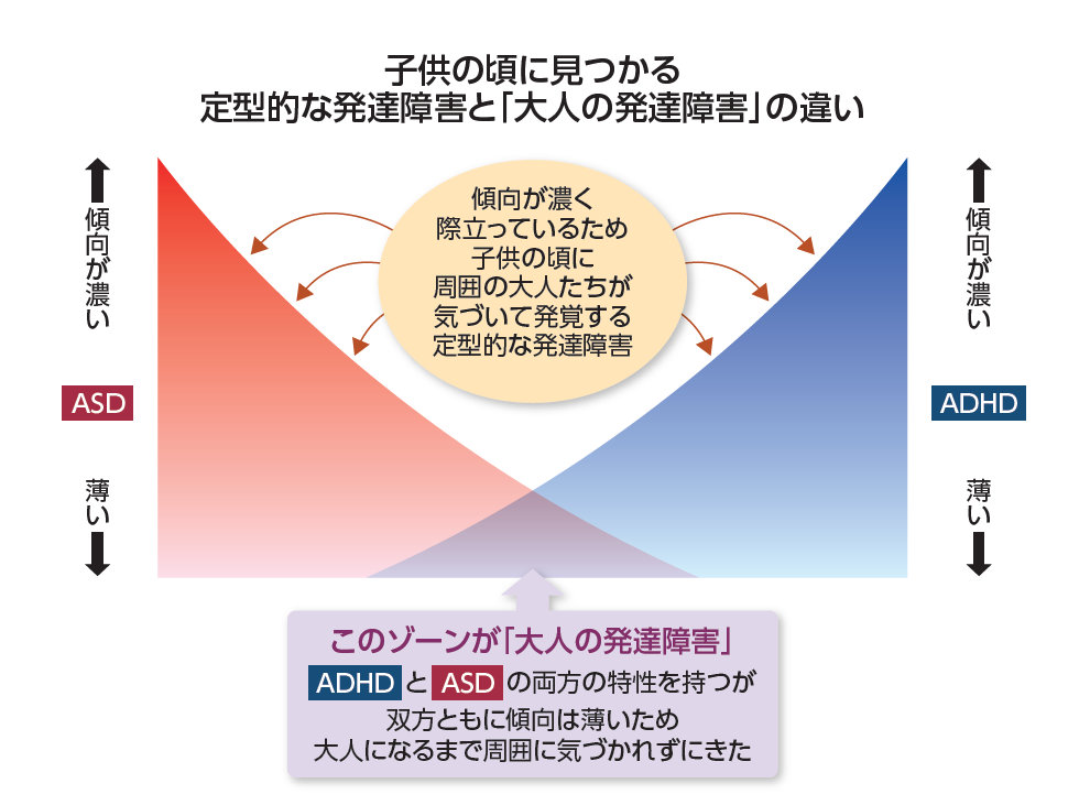 「子供の頃に周囲が気づくほど障害が強く現れる定型的な発達障害(赤と青の部分)」ではASDだけ、ADHDだけという、どちらかの特性が際立ってあります。その一方、「大人の発達障害(紫色の部分)」の場合は「大人になるまで周囲に発覚しなかったほど、特性の程度は薄い」のですが、ADHDとASDの両方の特性が共存して混ざっていることが多く、両方の特性による困りごとが現れてきます。