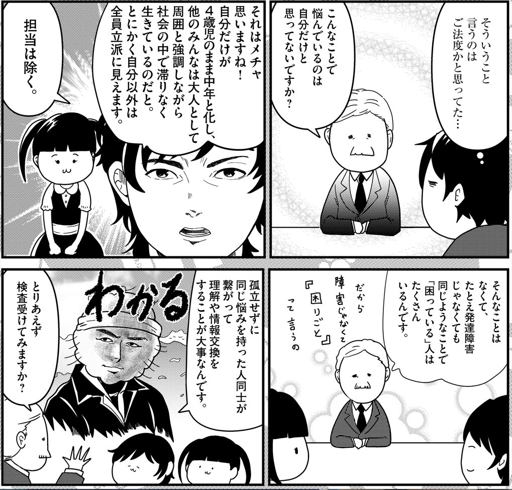 そこで、当クリニックを受診し、いくつかの検査やテスト、面談を経て「大人の発達障害である」という診断を受けました。そして、その一連のことをマンガに描き、障害のことを読者にわかりやすくマンガで伝えようとすることで、自分でも多くの発見があり理解が進んで整理がついていきます。