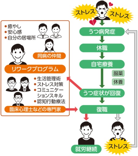 このような「うつ状態」などで休職した社員に、スムーズな復職と再休職予防を目的に実施されるリハビリテーションを「リワークプログラム」といいます。今ではかなり一般の皆さんにも知られるようになりました。