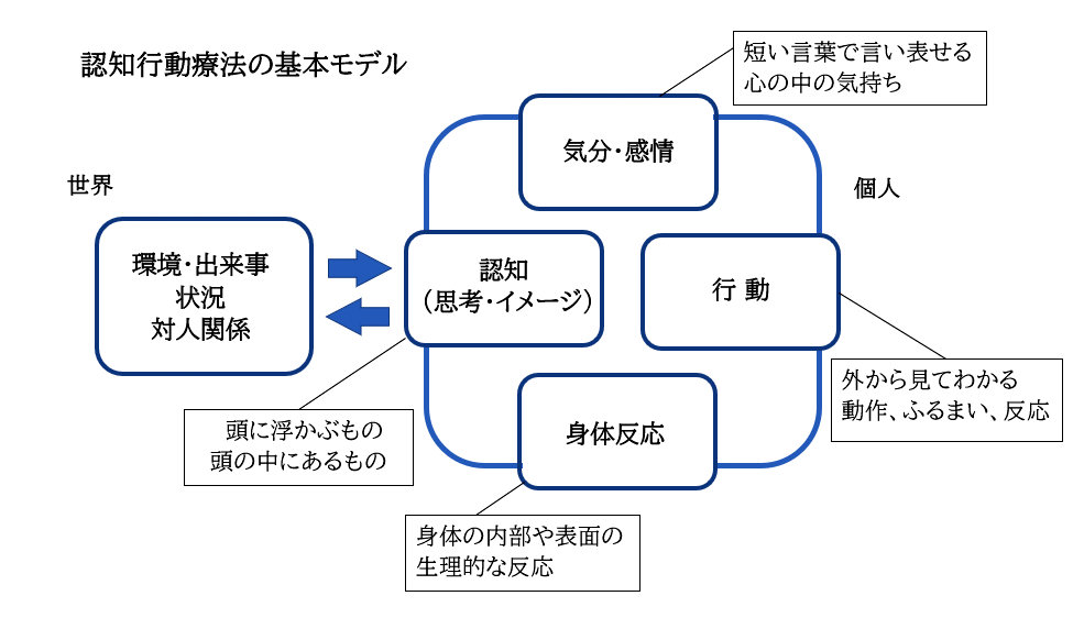 下の図は、認知行動療法の基本モデルです。