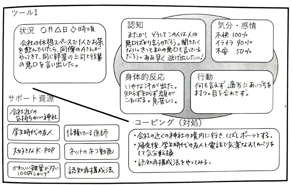 ここでは「会社近くの神社境内に行ってボーッとする」「学生時代の友人と電話で気楽なおしゃべりをして気分転換」といった対処=コーピングを見つけています。また、サポート資源を書き出すことで自分を支えるものがあることを確認できます。