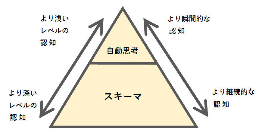伊藤CPP 認知行動療法で注目する「自動思考」は、何かの出来事に遭遇したその瞬間に、自動的に頭の中に思い浮かんだ考えや感情を言いますが、「スキーマ」はそうした反射的な反応ではありません。