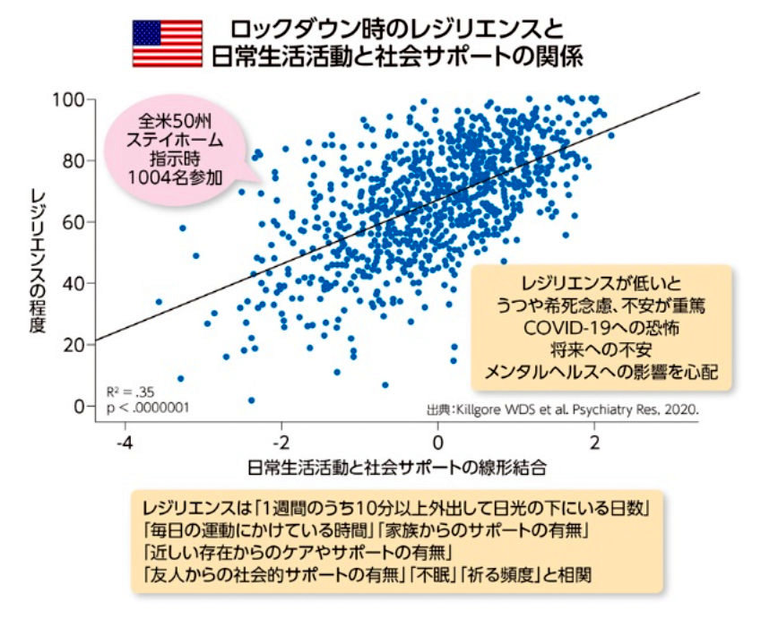 この研究では、ロックダウン中、グラフ下の黄色い部分の内容がレジリエンスの高さに関係したとみています。つまり、ロックダウン中であっても、下記のような行動を行っていた人はレジリエンスが高かったということです。