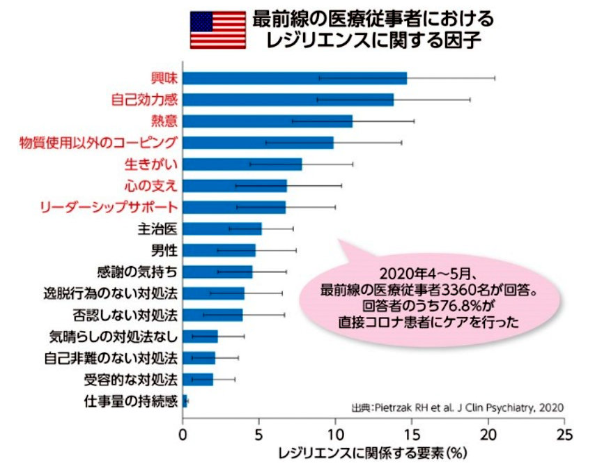 この調査は、そのコロナ治療の最前線にいた彼らが「どうやって自分を支えていたか」という、レジリエンスに関係する因子(要素)を調べたものです。