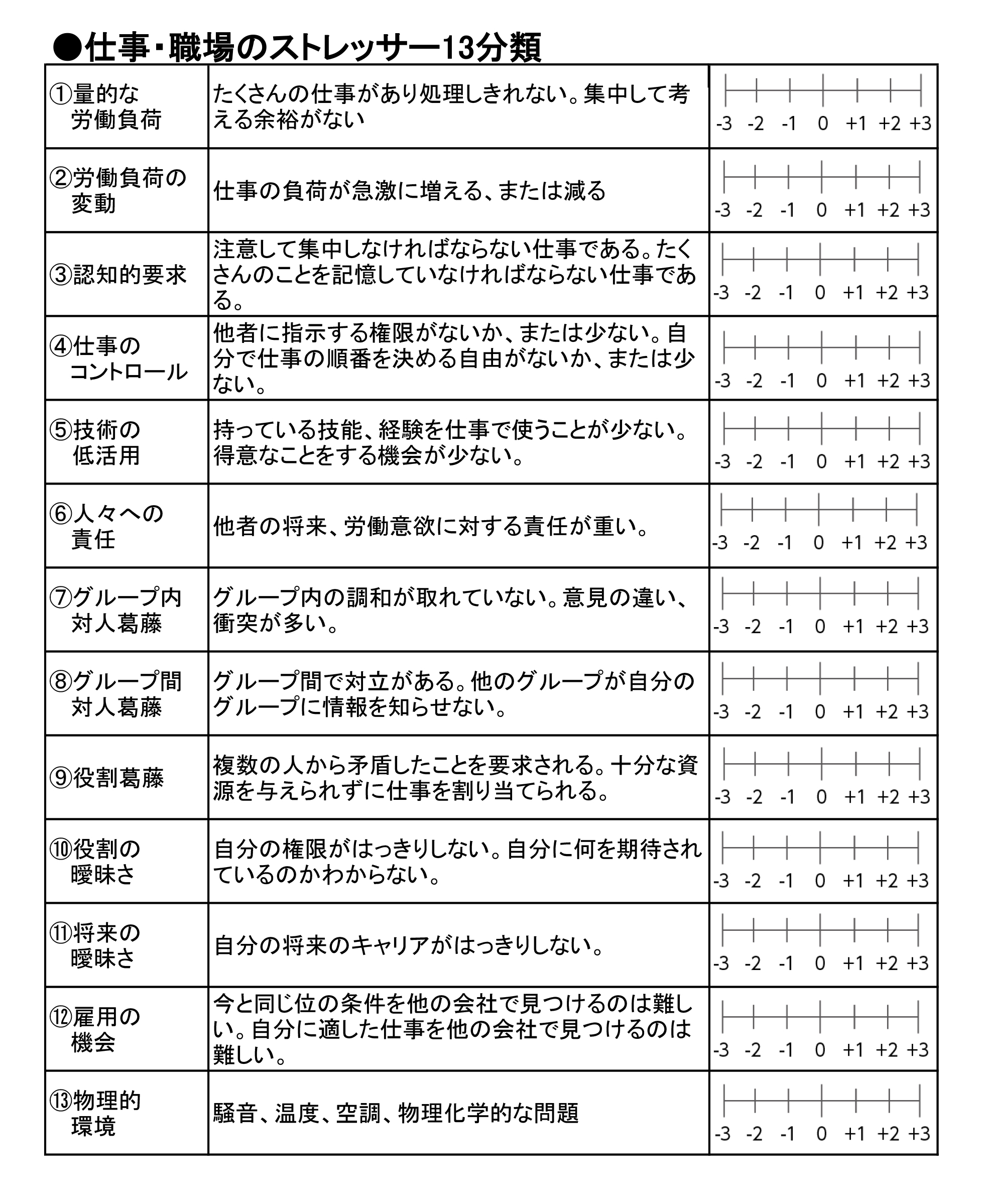 表の内容を読んでみてください。項目は13個ありますが、いずれも読んでいるだけでストレスフルな印象です。それぞれ、これらが自分にどう影響するかをチェックしていきます。